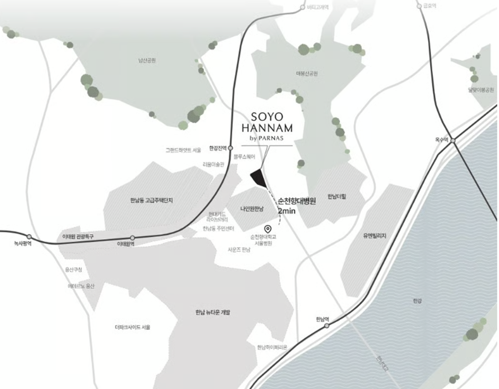 앞으로는 한강이 흐르고, 뒤에서는 민족의 명산 남산이 지켜주는 자리 가장 뜨거운 도시의 중심에서 가장 차분한 쉼의 만남 당신이 원하던 그 자리에 소요한남이 있습니다. 세상의 부러움이 모이는 자리 한남동에서 마주하는 고요하고 평온한 당신만의 삶 자연의 여유로움과 도시의 다채로움 사이에서 당신을 향한 배려가 자연스럽게 이어지는 이곳 말하지 않아도 이미 SOYO HANNAM by PARNAS